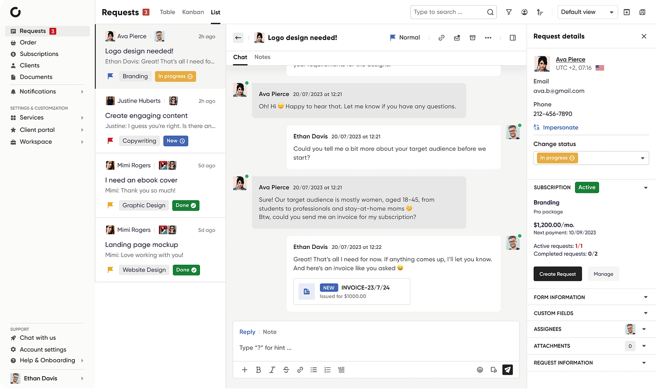 Zendo offers a much more in-depth insight into the projects for clients; they can easily communicate with the assigned agents in chat — bypassing the need for an endless back-and-forth exchange of email messages — reject or approve quotes, pay for invoices, and share files. They can also submit new requests and subscribe to unlimited-type of services, and personally move the requests around on the Kanban board.